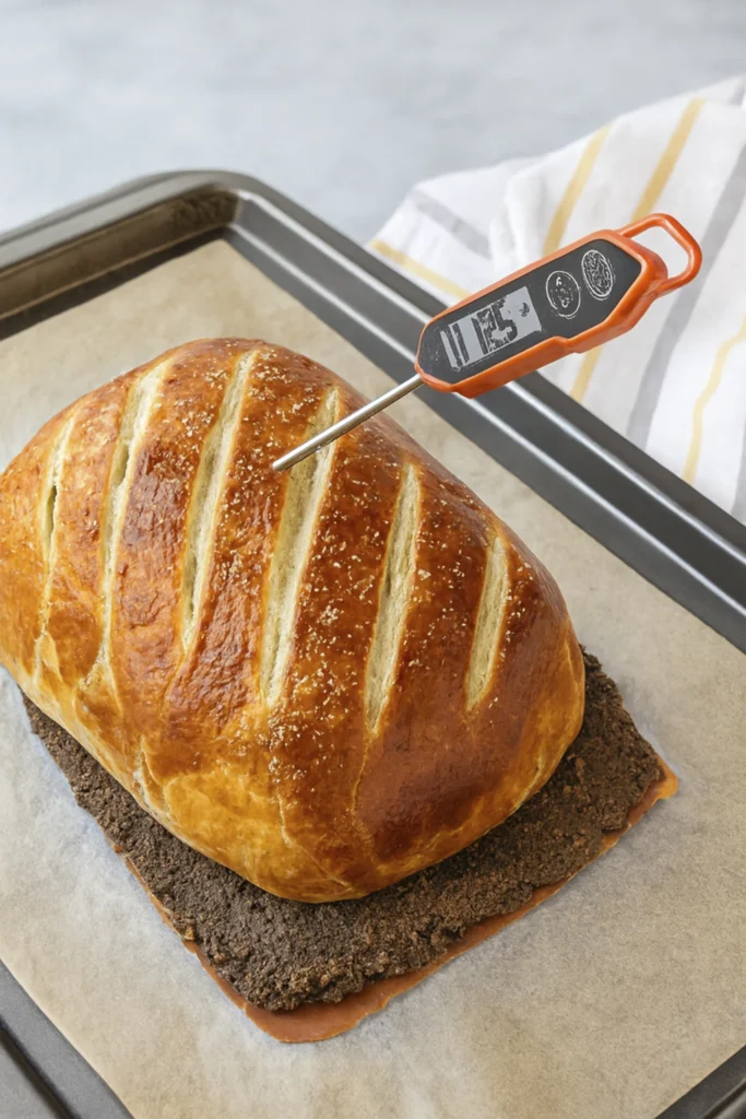 Score the pastry for decoration, sprinkle with flaky salt, and bake at 400°F for 25–35 minutes. For medium rare, aim for an internal temperature of 125–130°F.