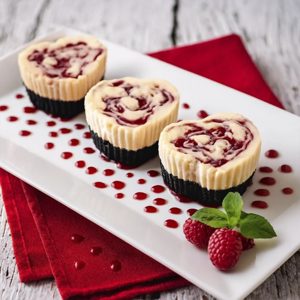 Keywords: mini cheesecake, raspberry swirl cheesecake, heart shaped dessert, valentine’s day cheesecake