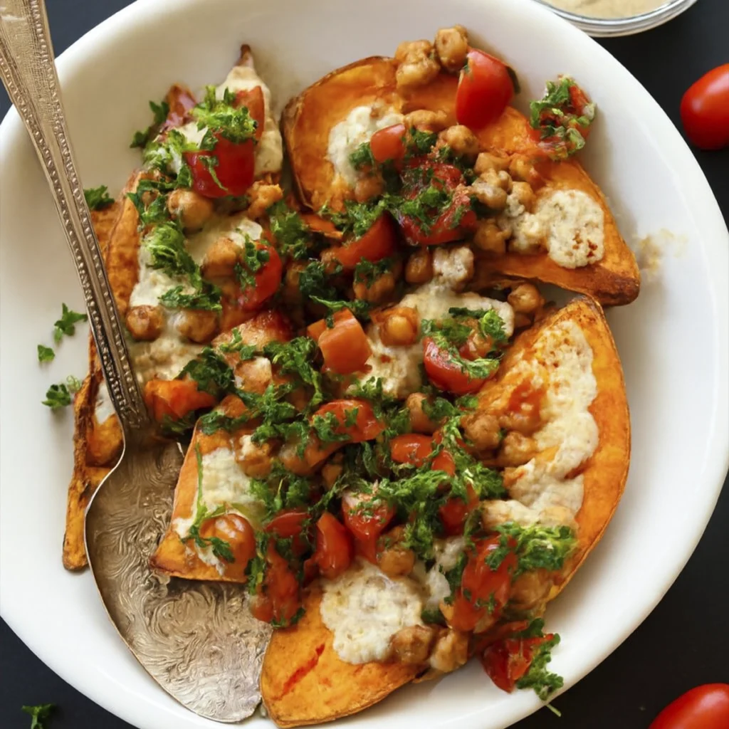 Mediterranean Baked Sweet Potatoes combine tender roasted sweet potatoes, spiced chickpeas, a creamy garlic herb sauce, and a fresh parsley-tomato salad. This wholesome, plant-based dish is naturally vegan, gluten-free, and packed with Mediterranean-inspired flavor.